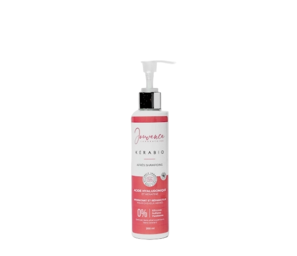 L’ Après Shampoing Kerabio – Jouvence répare et hydrate les cheveux abîmés grâce à sa formule à base d’acide hyaluronique et de kératine, offrant une senteur délicate de jasmin.